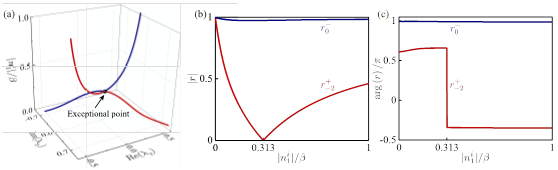 图2 (a)散射矩阵本征值随损耗的变化轨迹。(b)反射系数幅值和(c)相位随损耗变化的示意图。